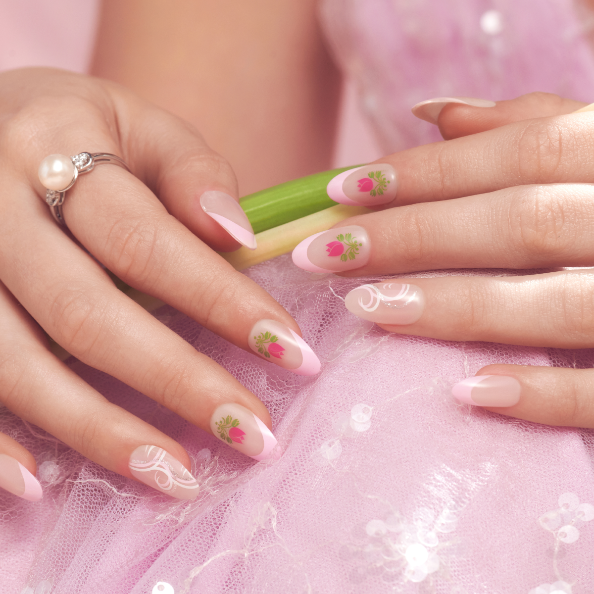 - ‘Tulip Harvest’ is a set of almond press on nails medium that are pink-tipped with a tulip design & white swirls